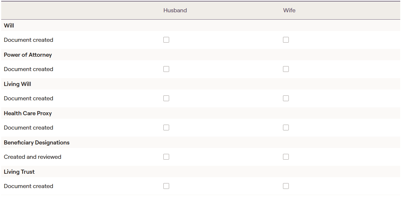 We ensure our clients have the basics of their estate plan in place with our basics checklist. In the event a client has an incomplete estate plan, needs an update, or no estate plan to begin with, we introduce them to our trusted legal partners to make sure their wishes are fulfilled.