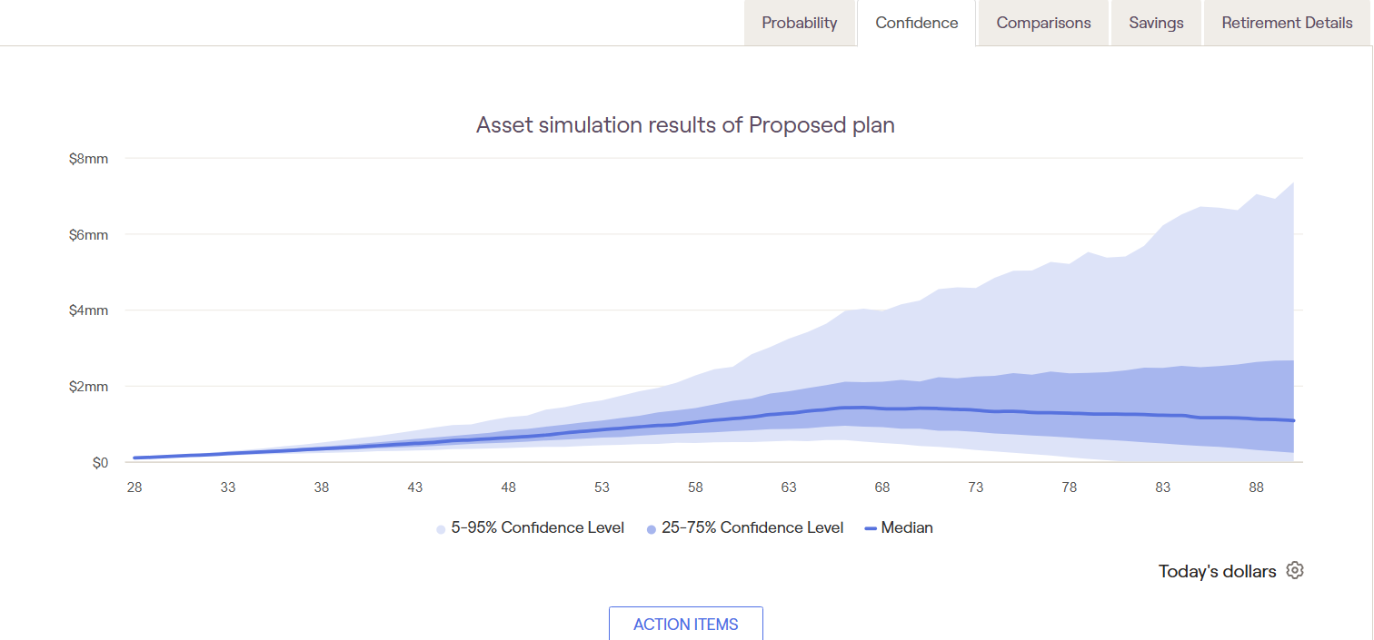 We use a detailed retirement analysis tool to assess whether you are on track for a successful retirement. This allows us to make informed recommendations tailored to your goals. Monte Carlo simulations, stress tests, and scenario analysis help us evaluate your retirement plans and understand the potential impact of different changes.